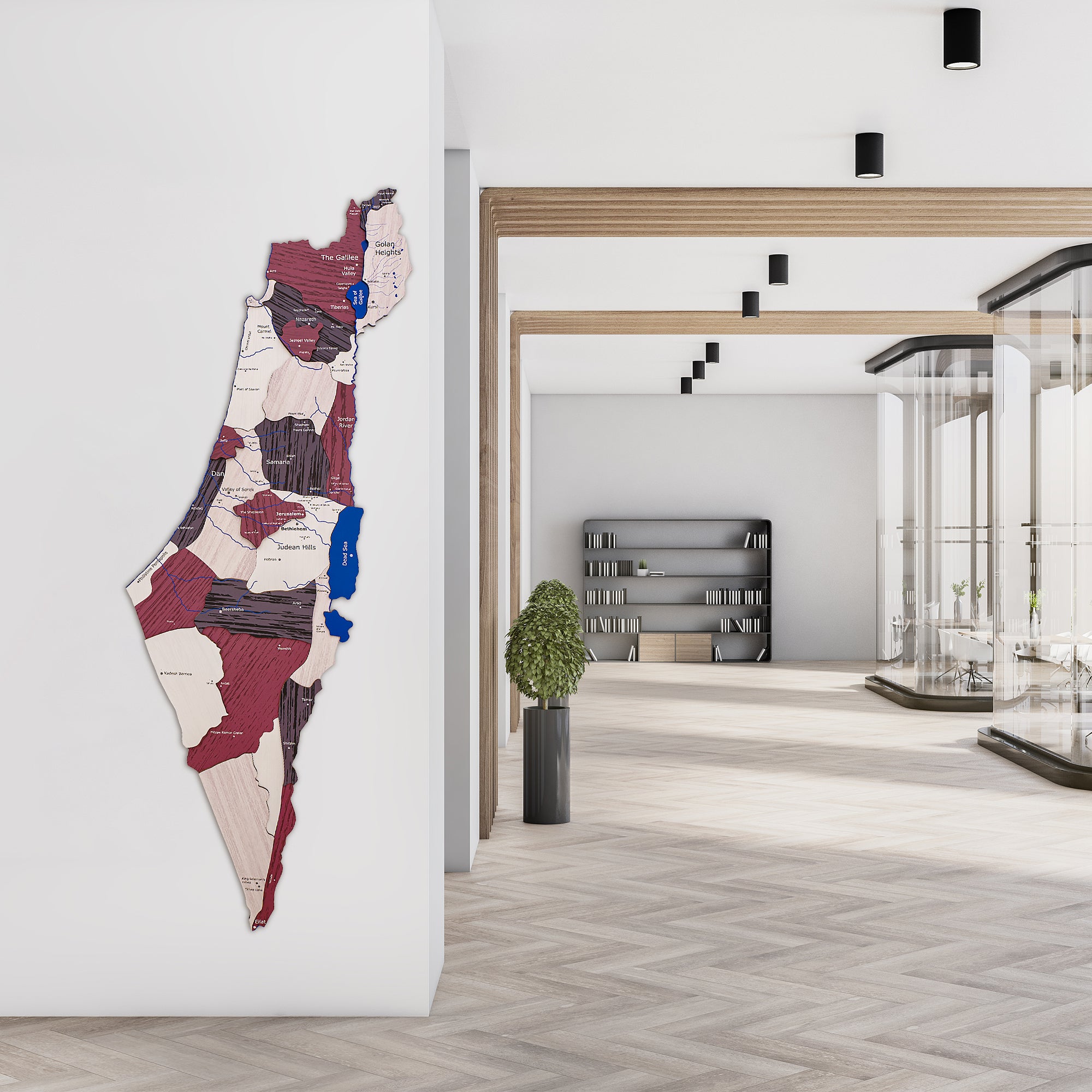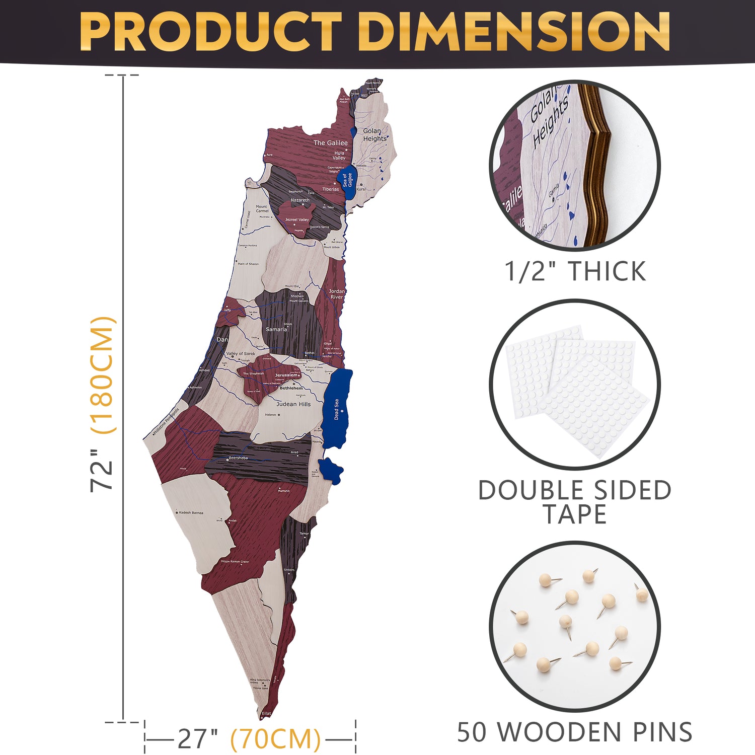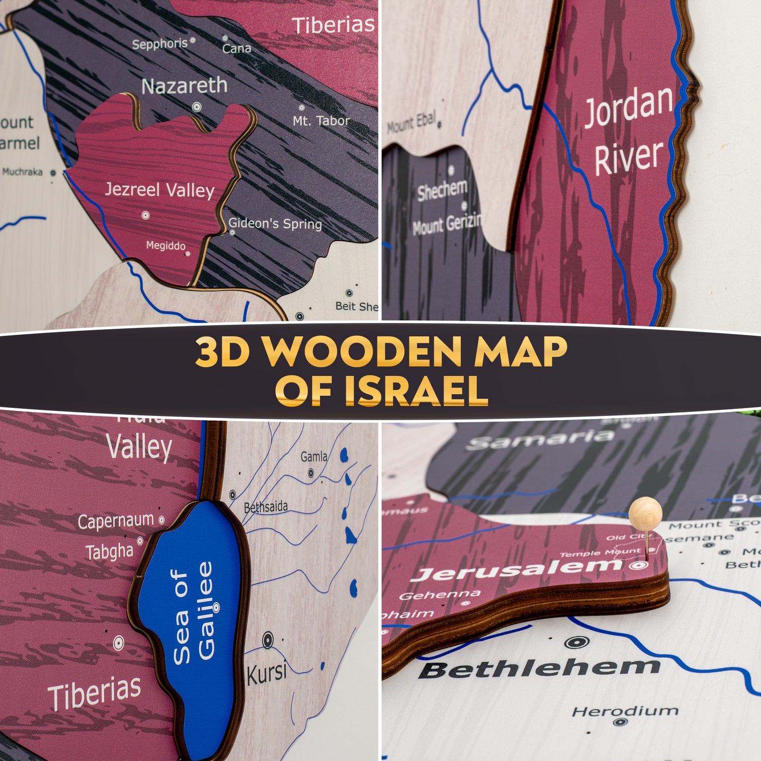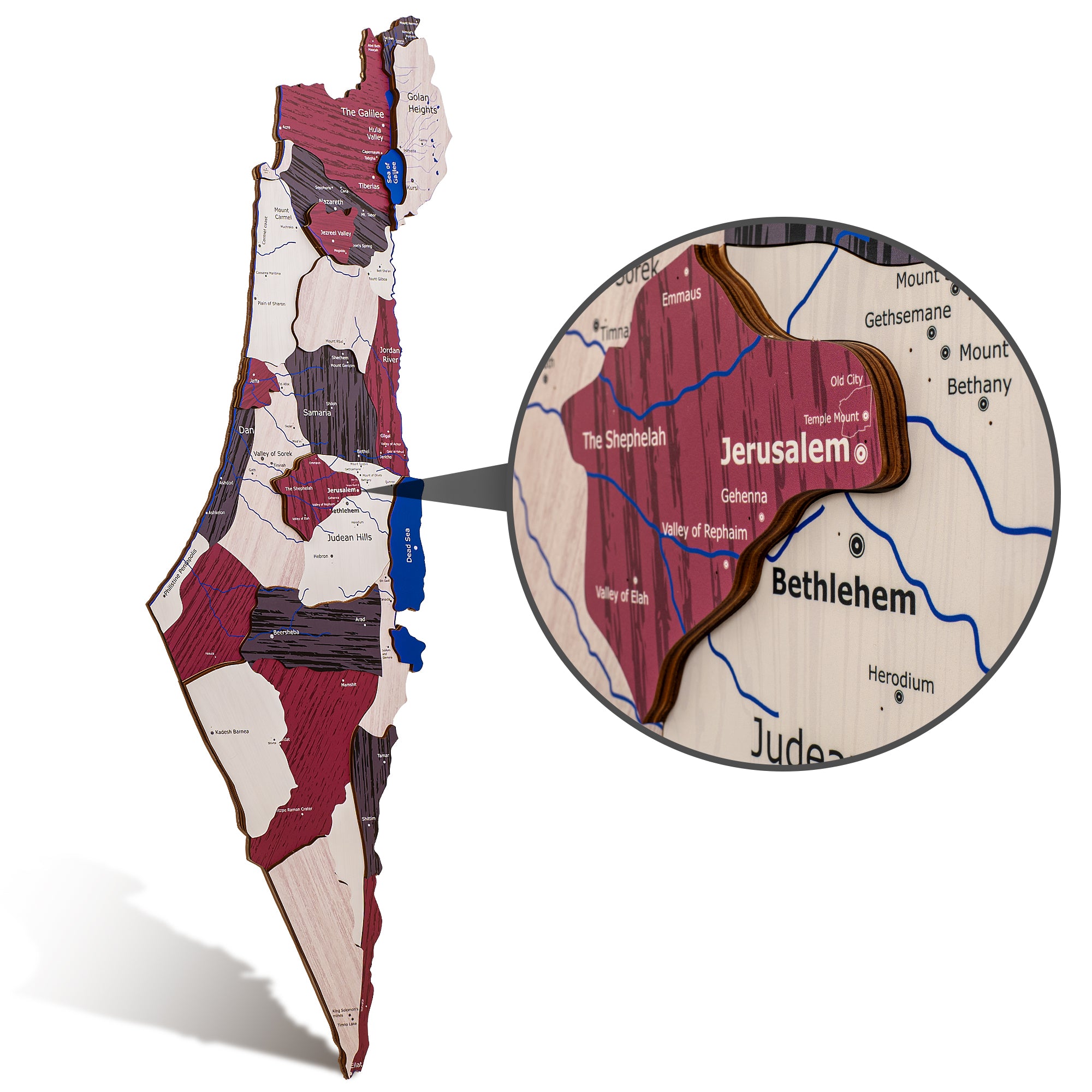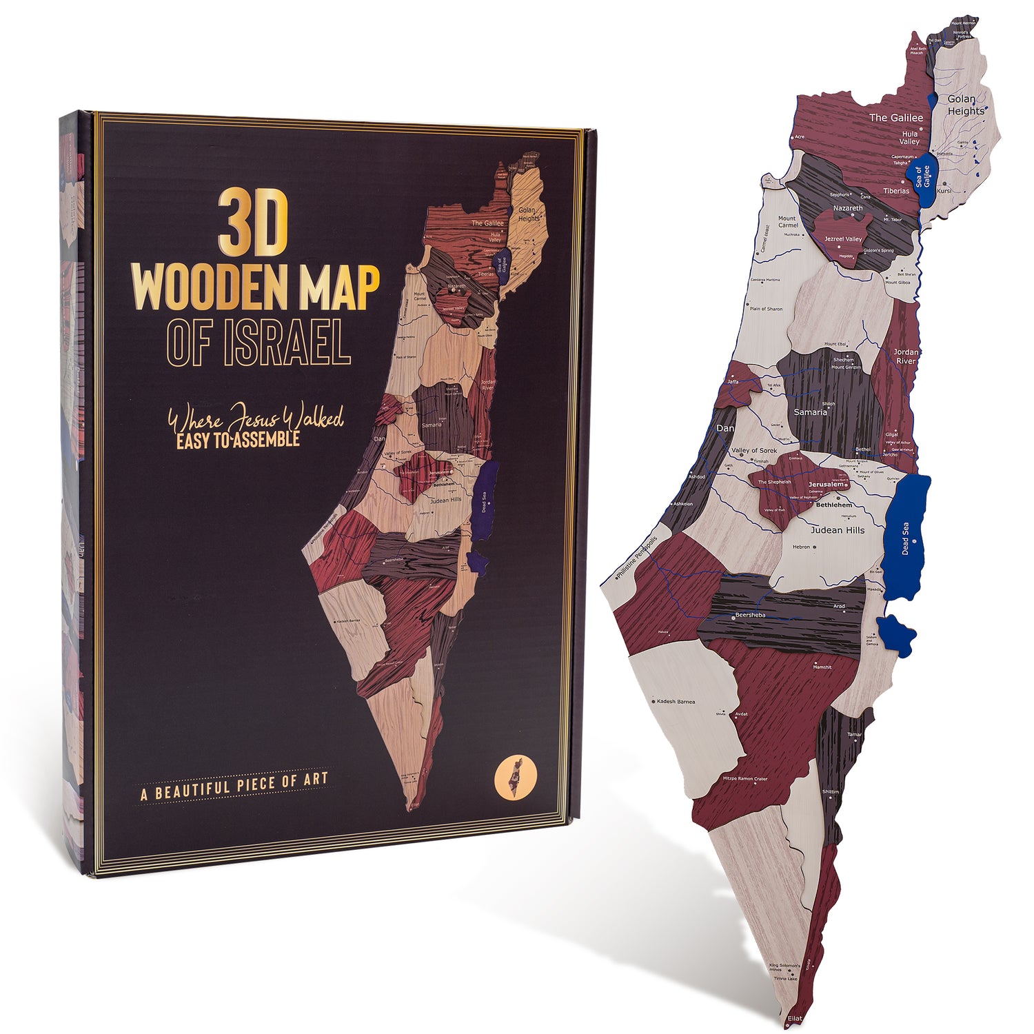 Our 3D wooden map of Israel is a detailed and accurate representation of the land referenced in the Old and New Testaments. Measuring 72" high by 27" wide, it highlights key locations relevant to Christianity, meticulously researched and artistically presented.