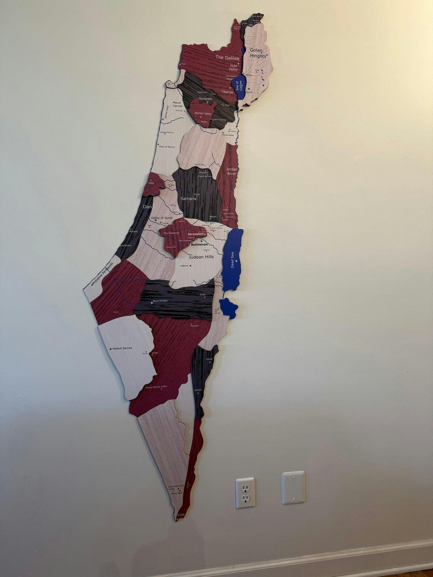 Our 3D wooden map of Israel is a detailed and accurate representation of the land referenced in the Old and New Testaments. Measuring 72" high by 27" wide, it highlights key locations relevant to Christianity, meticulously researched and artistically presented.