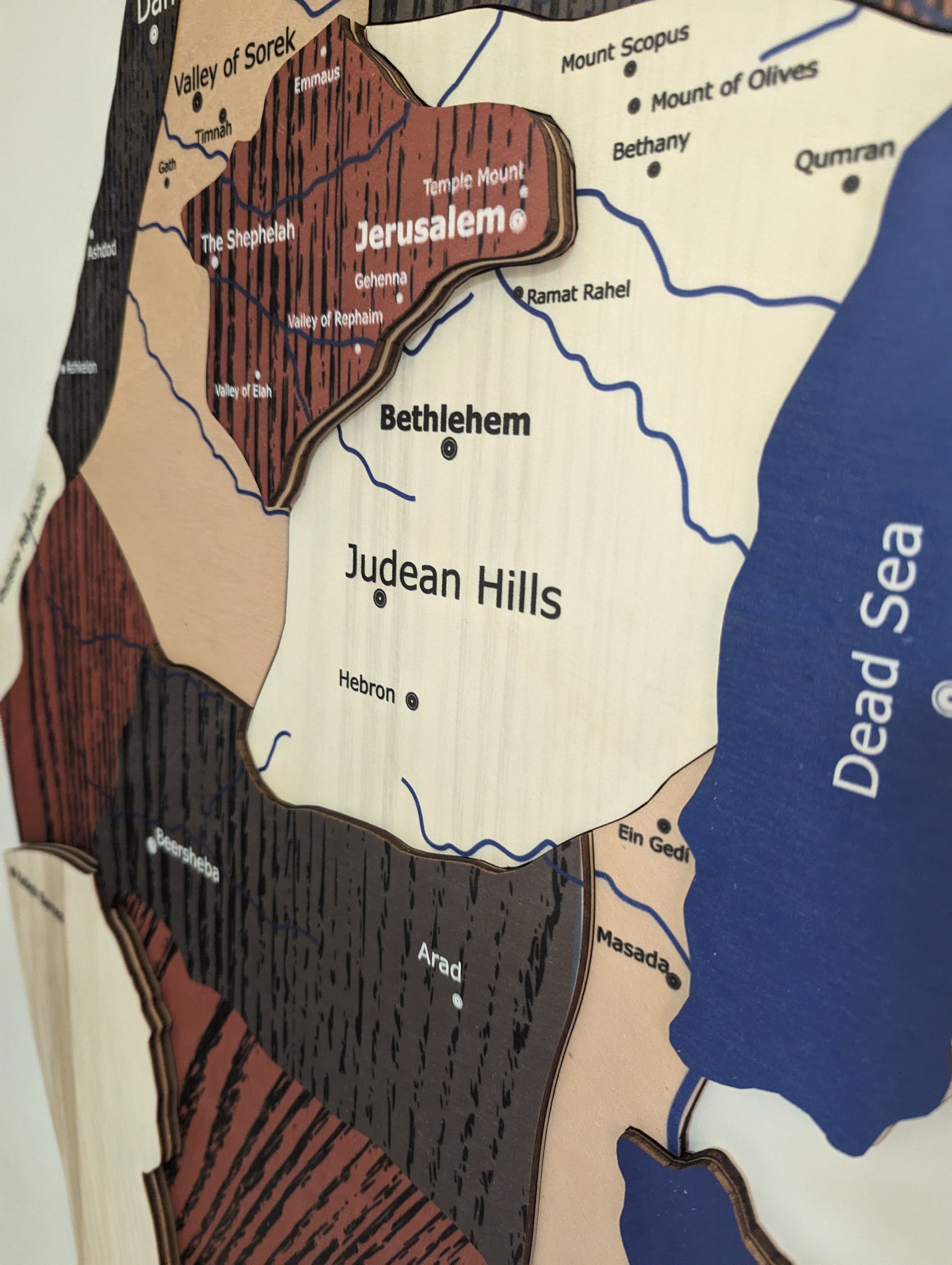 Dive deep into the rich history of Israel with our 3D wooden map. This piece is not only a beautiful decoration but also an educational tool, highlighting the biblical locations that are central to our faith.